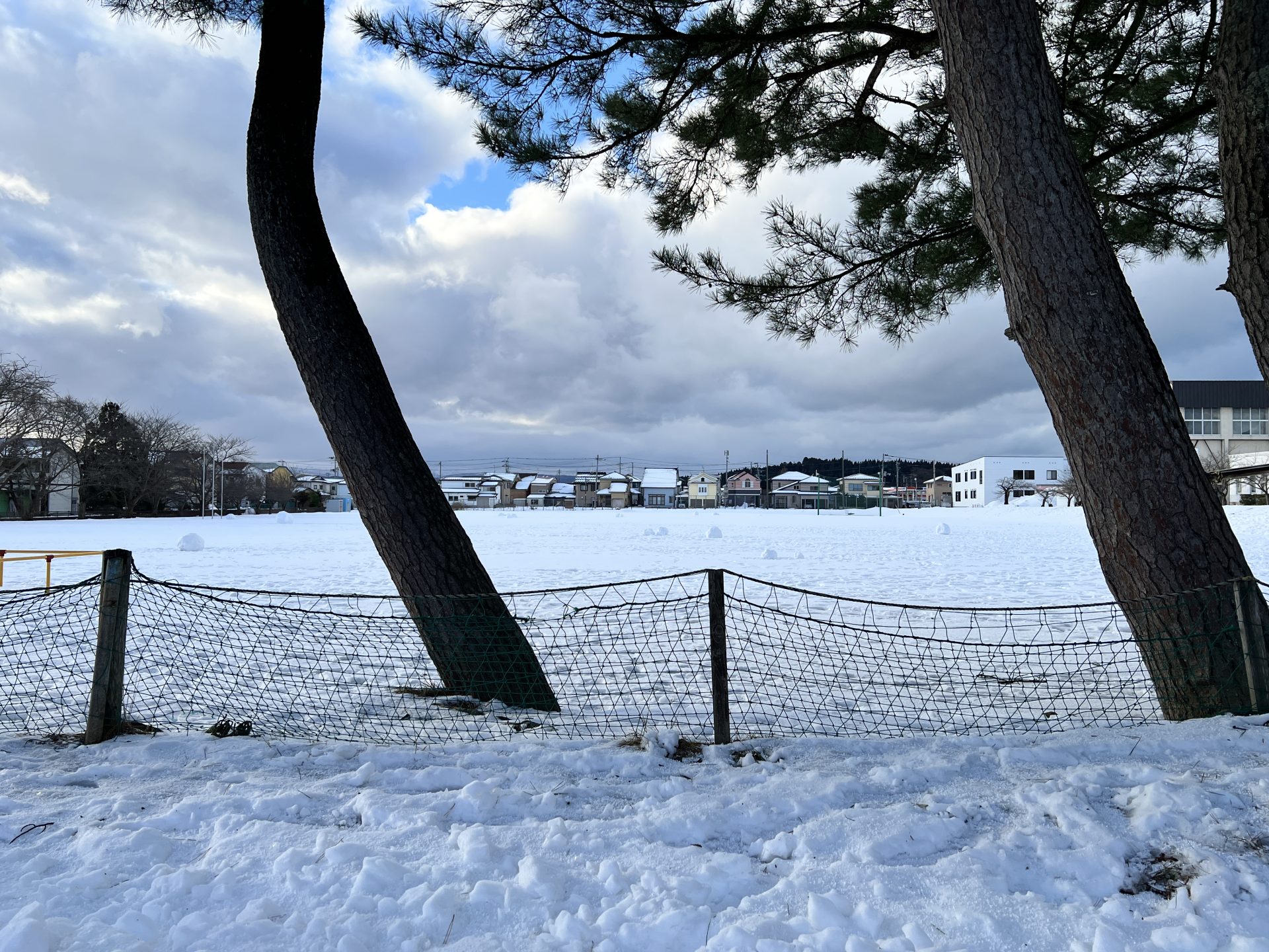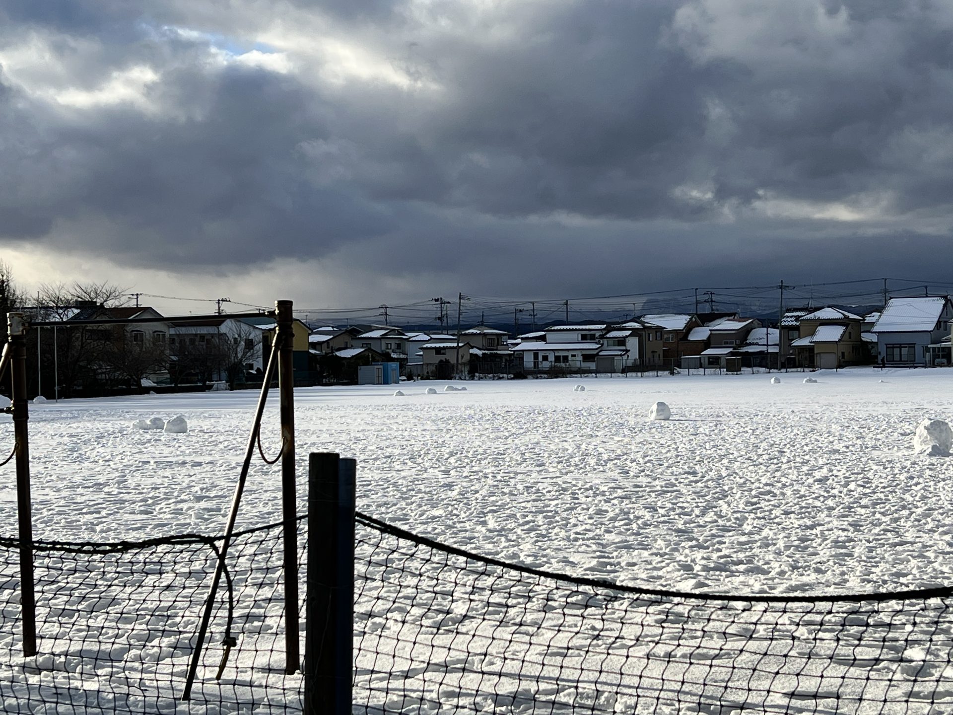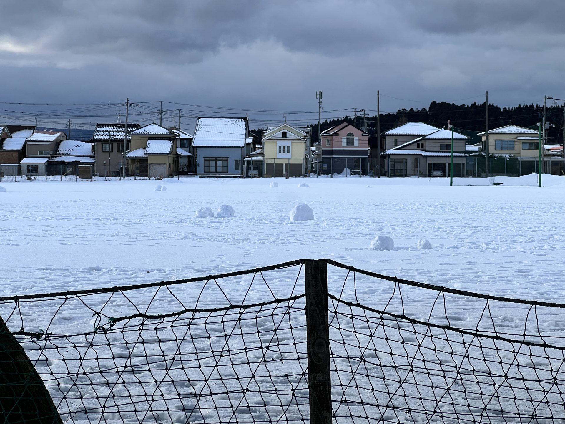 写真が見えづらいですが、グラウンドのいたるところに大玉の雪がゴロゴロ転がっています。