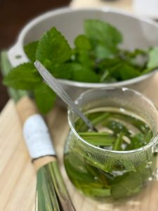 柿を採った際、足元に生えていたレモンバーム(ミント?)をいただいて、持っていたレモングラスと合わせてハーブティーを作ってみました。