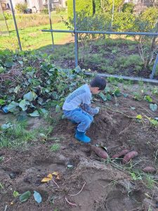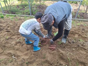 二男はおじいちゃんが三又鍬で土を掘り起こした後に、シャベルで芋を掘りだす係。