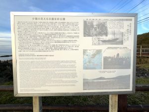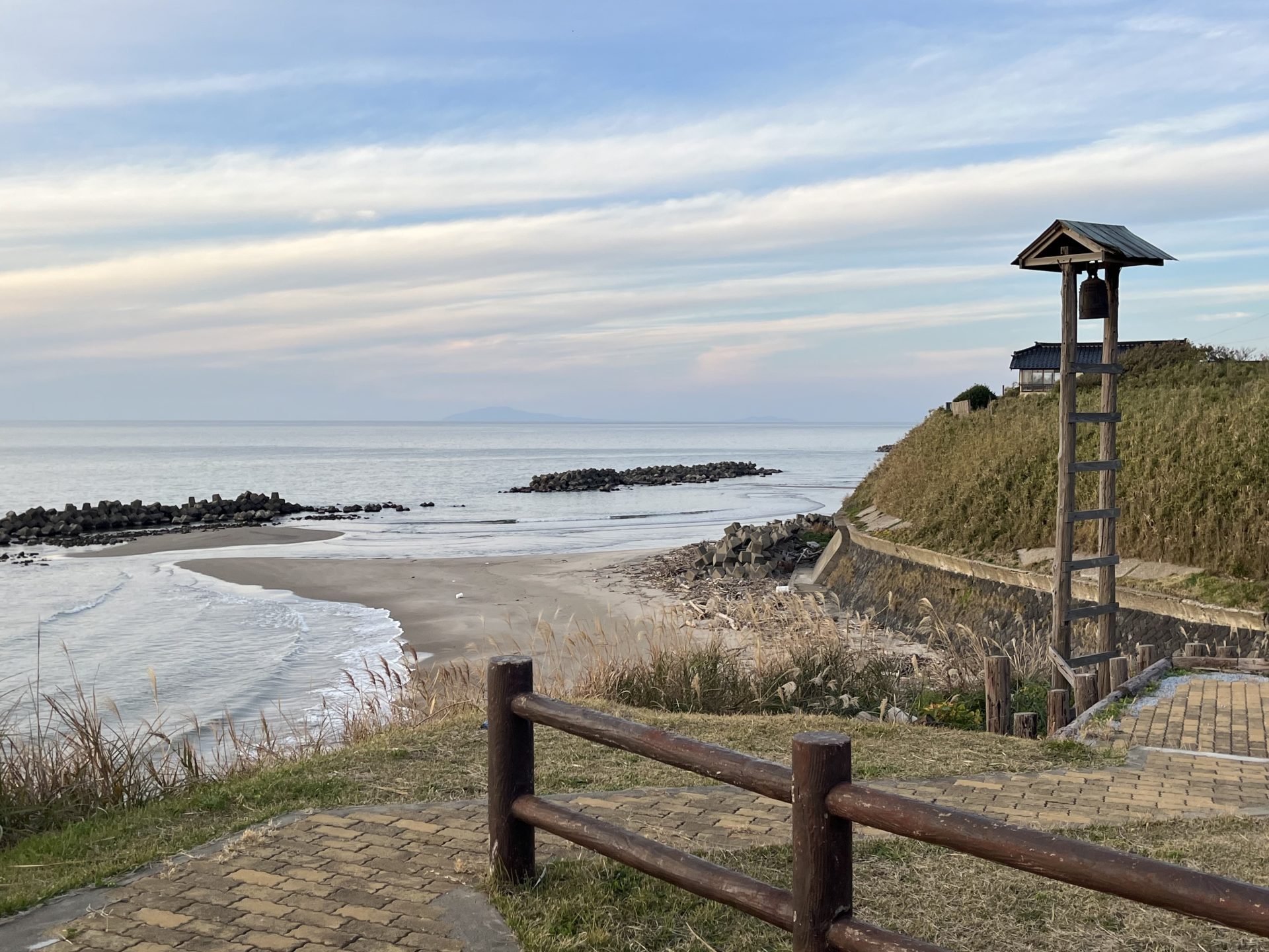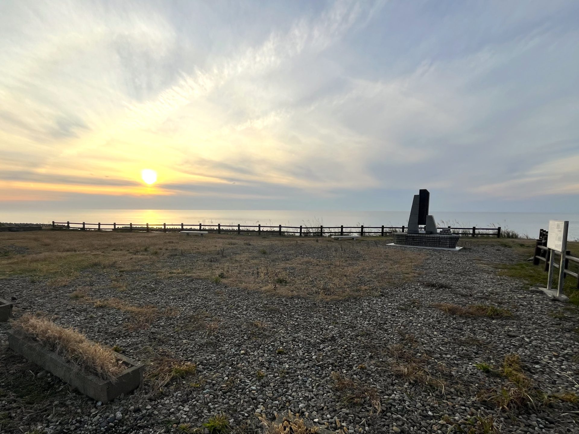 そしてこちらが慰霊碑のそばから見た夕陽です。93年前の漁船の漂流が物語るように、日本海は荒波のイメージが強いですが、こうした凪の日にのんびりと眺める夕陽はやっぱ格別ですね。また、北の方へ目をやると、うっすらと見える男鹿半島。こう見るとけっこう遠くに感じるものです。