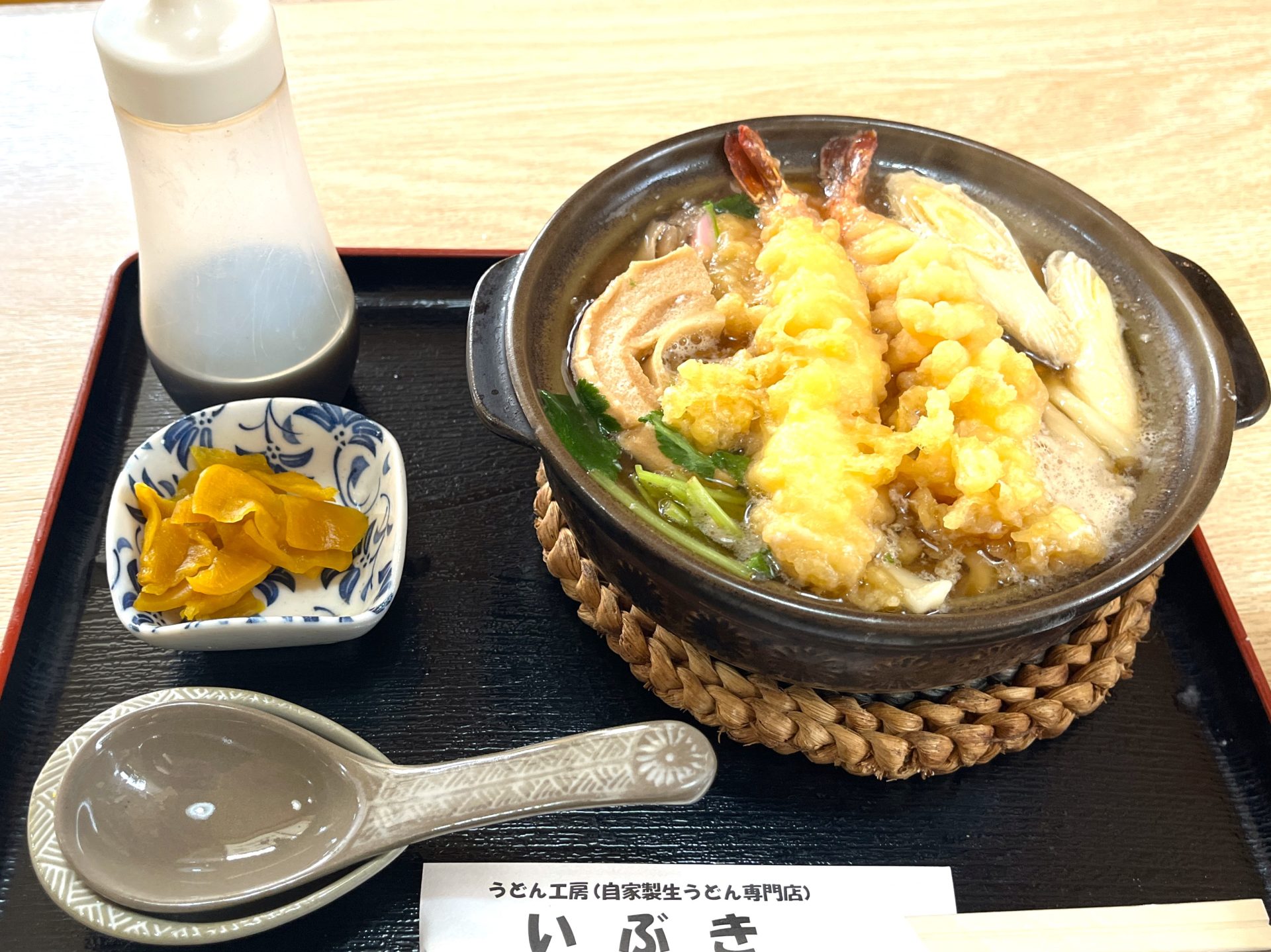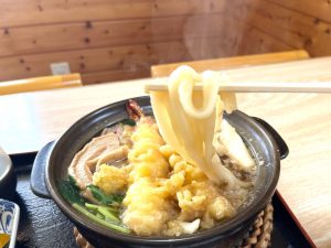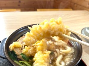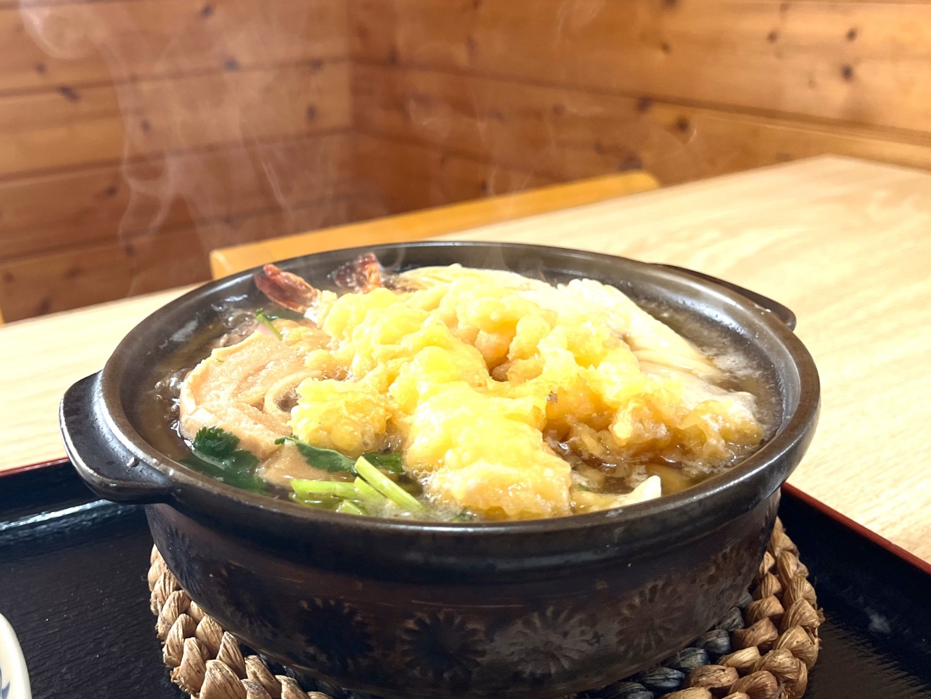 鍋の蓋を取った瞬間の、爆発的な湯気の広がり具合を動画で収められなかったのは反省点ですが、それでも熱々さが伝わってくるその迫力。うどんは太めでもっちもち、大きなエビ天は衣負けせず弾力のあるぷりっぷりの食感で、ネギやセリ、シイタケなど季節の野菜も豊富です。