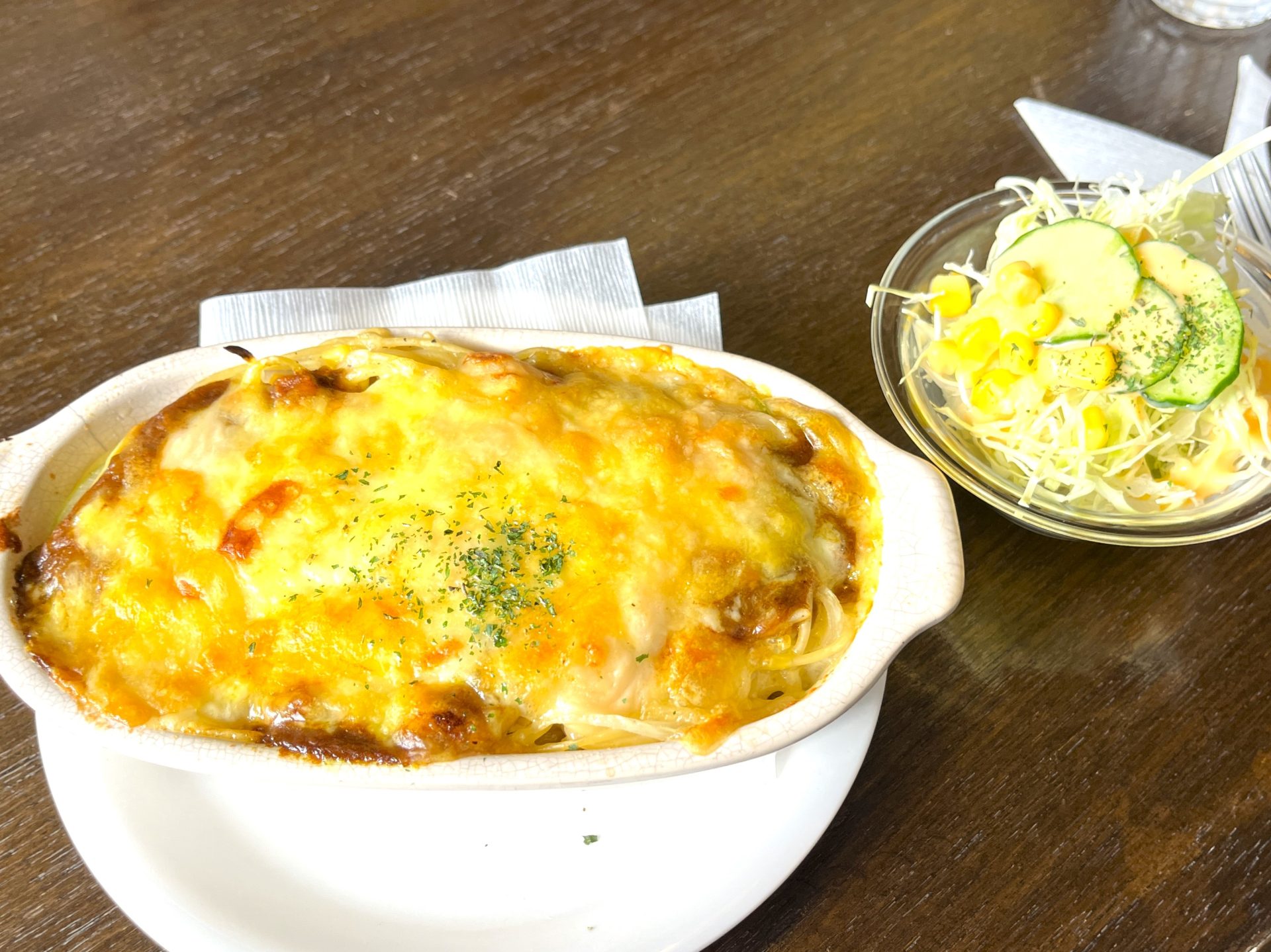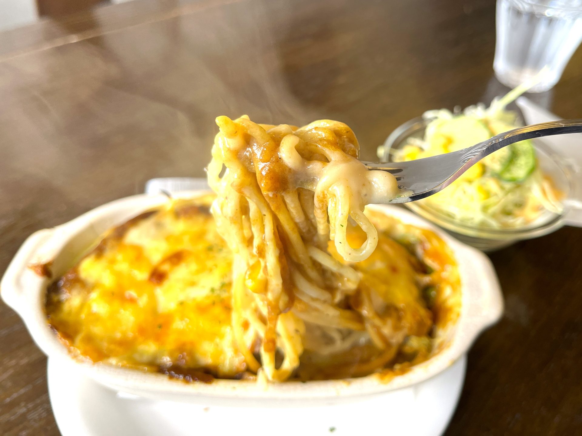 ここで猫舌のヒロシはすぐにかぶりつかず、いろんなアングルからの撮影タイム。少し落ち着いた頃に口へ運ぶと、チーズのカリカリ部分と濃厚ソースが麺に絡んで納得のおいしさ。途中、サラダやお冷やで口の中を冷ましつつ、最後まで熱々のスパゲティーグラタンを完食しました~~~♪