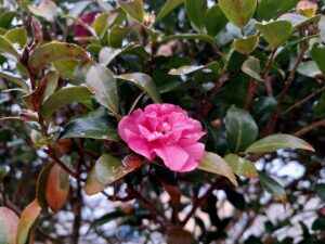 実家の裏では、椿の花が可愛らしく咲いていました。