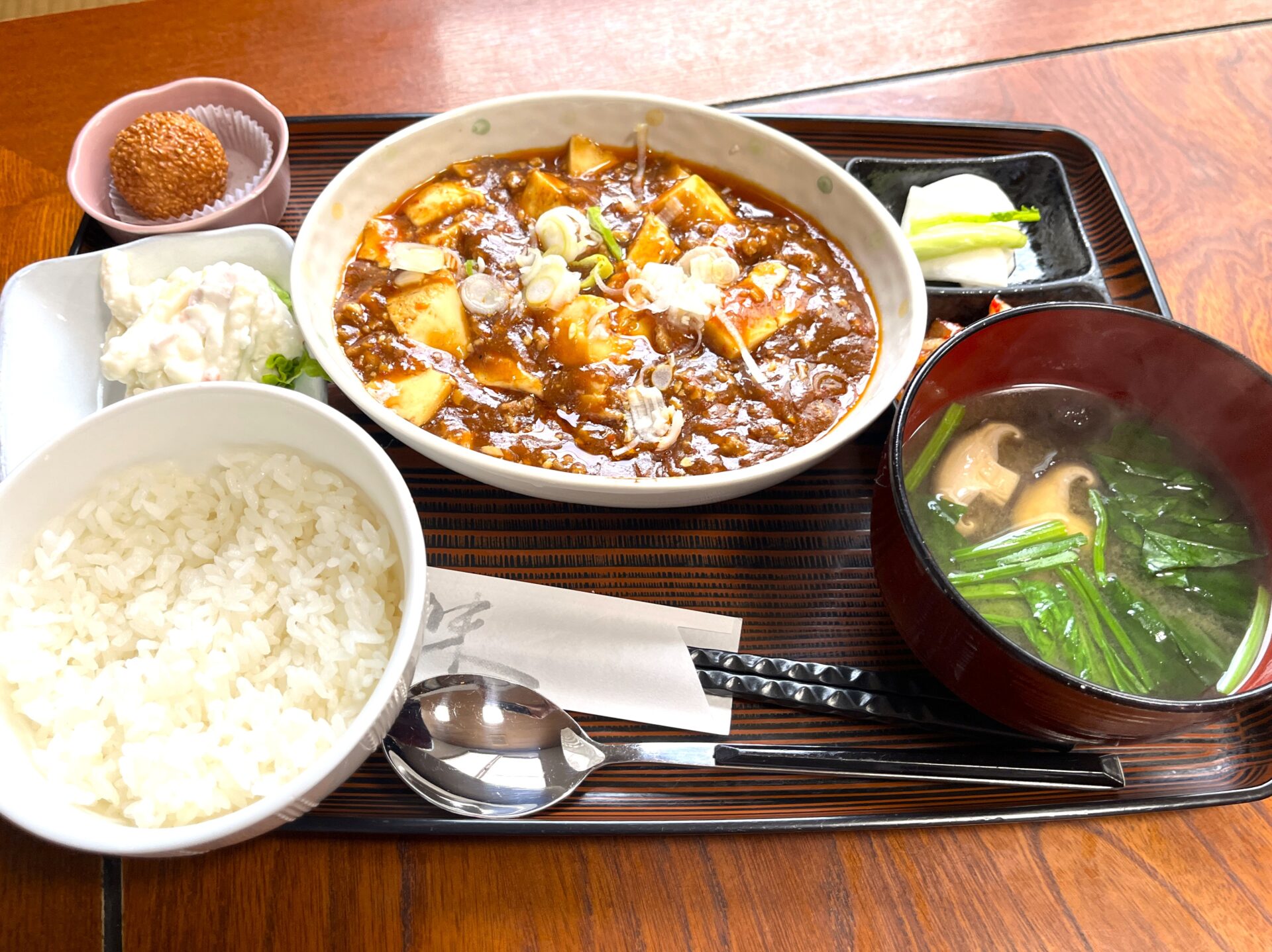 注文時に辛さを調節してくれるようでしたが、初めてだったのでそのままで。お味噌汁にゴマ団子とマカロニサラダ、そして漬物とキムチも添えられていてなかなかのボリューム感です。