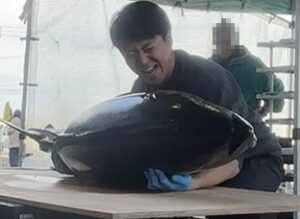 なんとなんと、解体を担当している係のおじさまにご指名いただき、このマグロを持ってみることに。