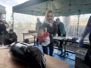 スタッフのお姉さんのご厚意で、長男を抱っこしてもらい、近くでマグロを見せてもらいました。
