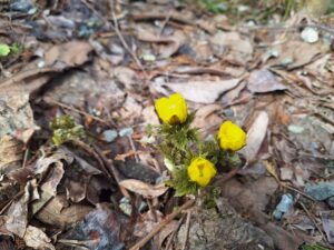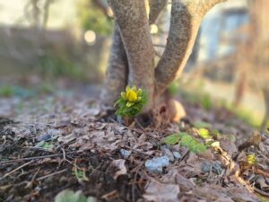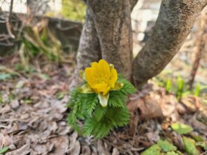 昨日の朝、実家の庭先に福寿草が咲きました。