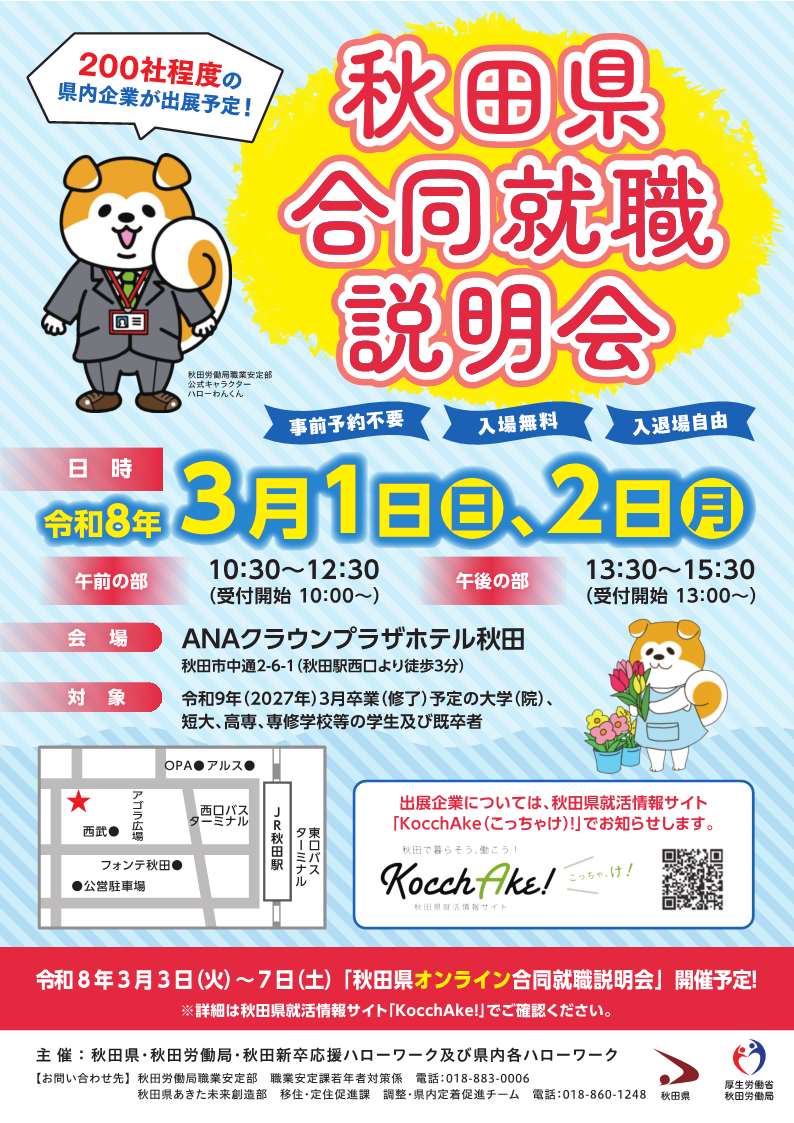 令和9年(2027年)3月に大学(院)、短大、高専、専修学校等(以下「大学等」といいます。)を卒業(修了)予定の学生等及び既卒者を対象に、「秋田県合同就職説明会」が開催されます。
