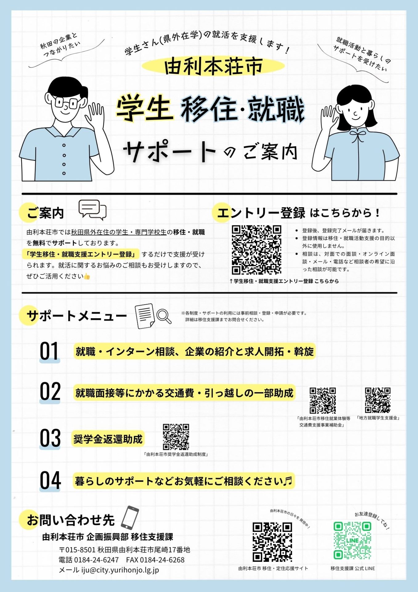 Webサイトにご来場いただきありがとうございます😊 移住支援課では、秋田県外の大学に在学する学生さんの就活を支援します! 支援をご希望の方は学生支援エントリー登録するだけでOKです✨ 就活に関するお悩みのご相談もお受けしますので、ぜひご活用ください👍
