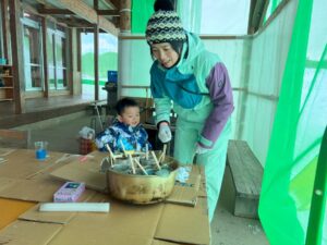 インタビューを終えたお母さんも合流してロウソクづくり🕯️