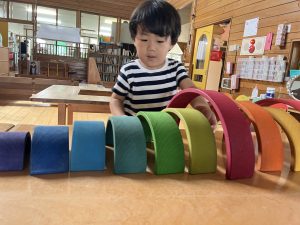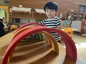 園長先生の説明をよそに、園内のおもちゃに興味津々のお兄ちゃん。さっそくトンネル状に並べて遊んでます。