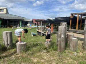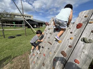 そうしているのも束の間、今度は人懐っこい在園児にさそわれて園庭へ。登ったり跳ねたり走り回ったり、広々とした遊び場で思い思いに動き回って楽しそうです。